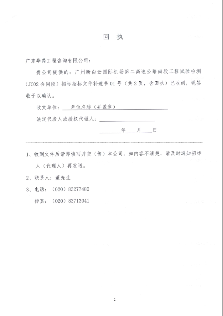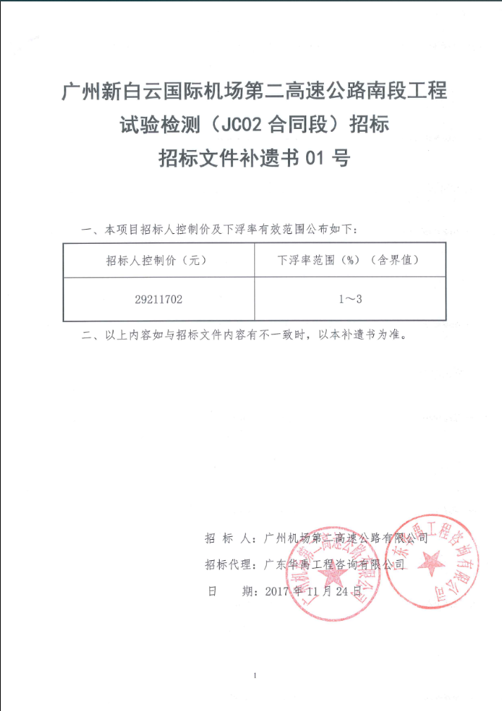 招标通知 - 广州新白云国际机场第二高速公路南段工程试验检测(JC02合同段)招标 招标文件补遗书01号