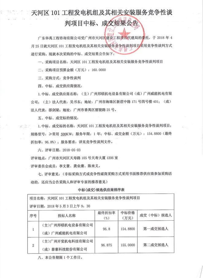 中标公告 - 天河区101工程发电机组及相关安装服务竞争性谈判项目中标、成交结果公告